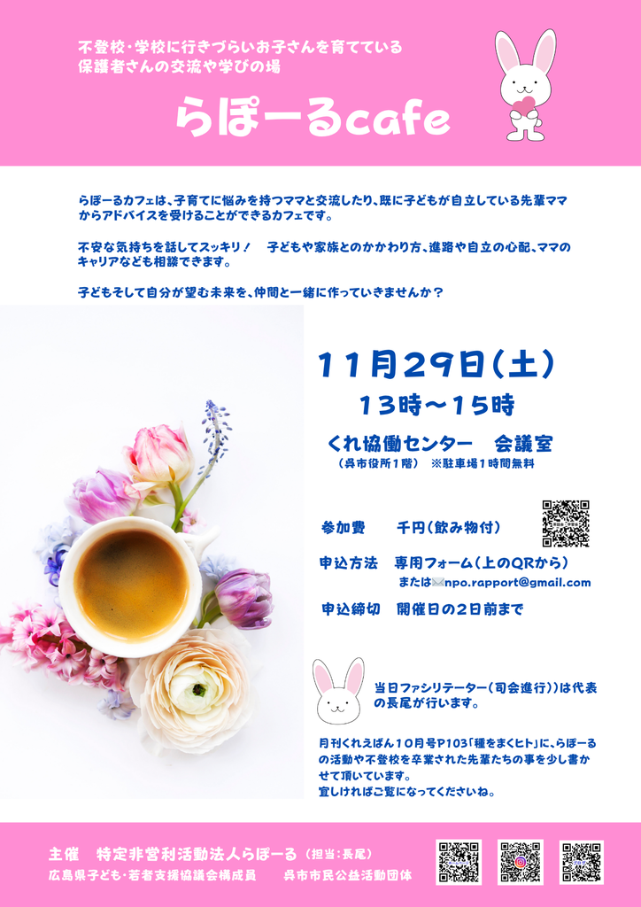 土曜開催【不登校/保護者対象】らぽーるcafe 11月29日